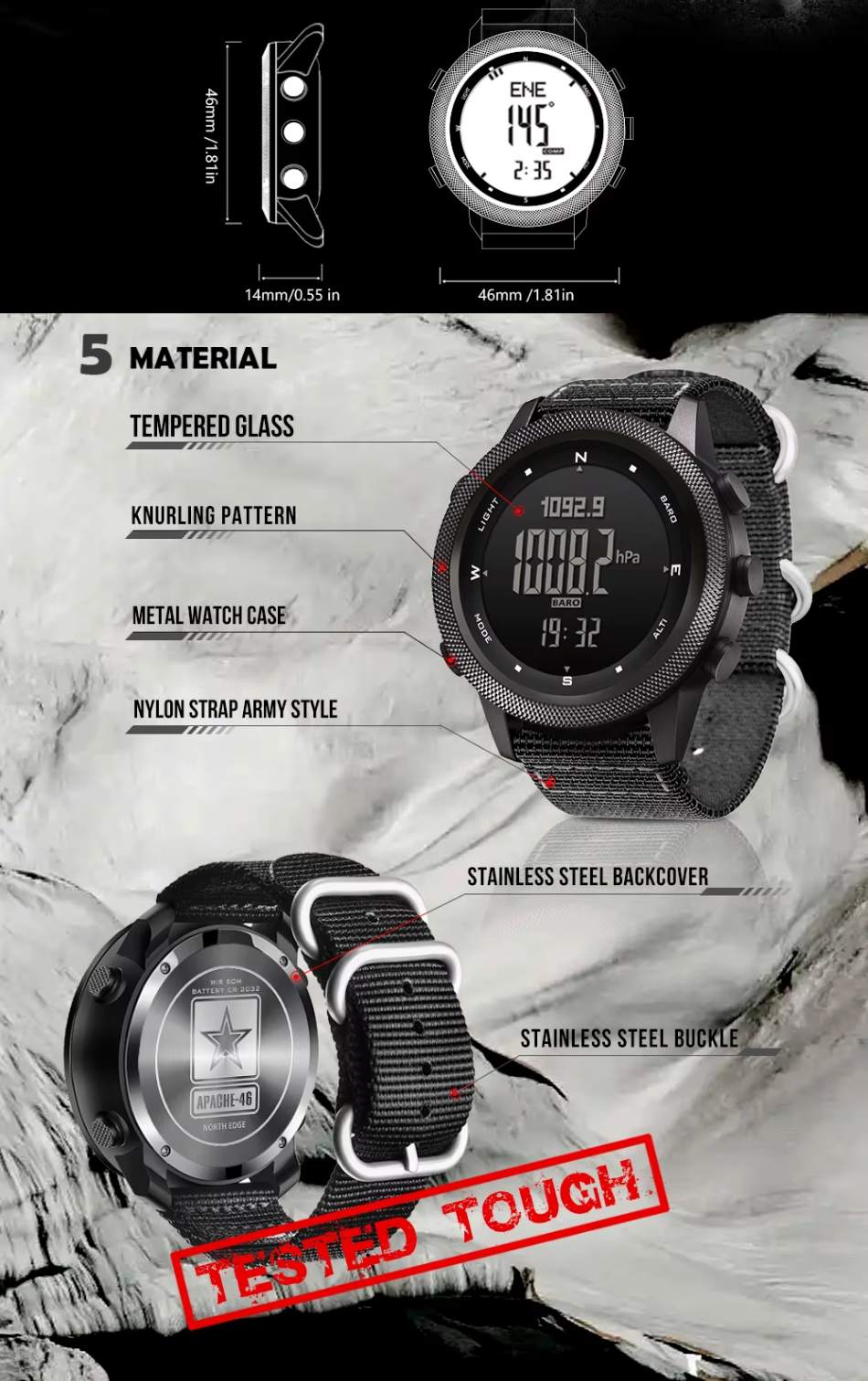 Seus mostradores de led de alta resolução protegidos por um visor de vidro temperado mostram a qualidade do Edge 46. Sua fivela de nylon militar, a coroa serrilhada bem como a fivela de aço inoxidável complementam a estética deste acessório.