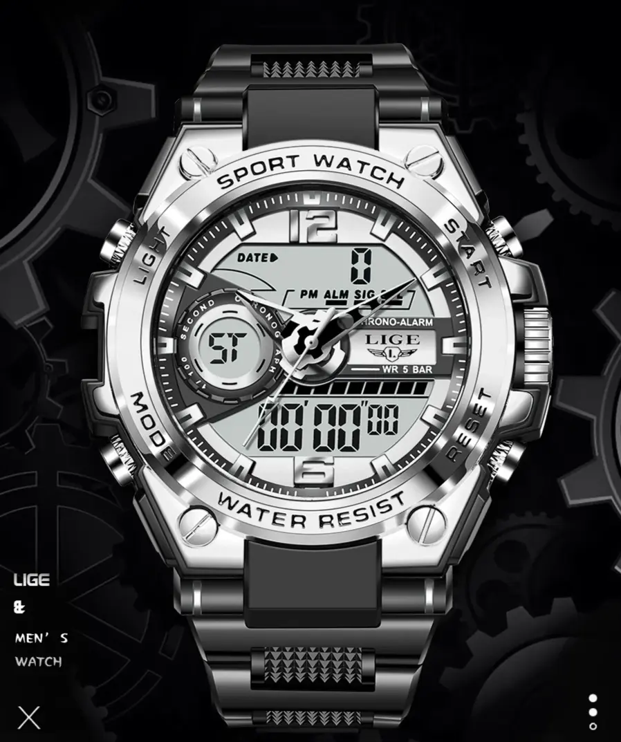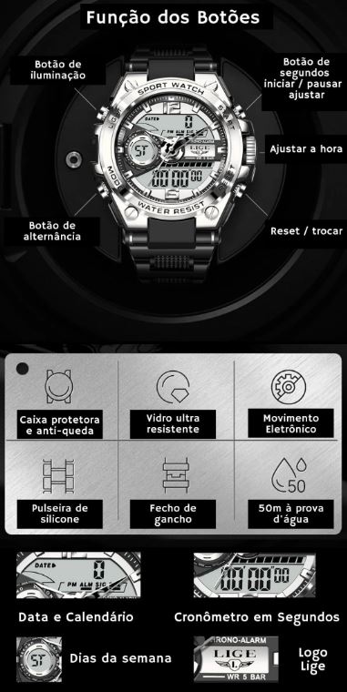 Equipado com tecnologia digital, possui movimento a quartzo unindo a elegância do análogo com a sofisticação da tela de LED garantindo precisão e durabilidade. Com pulseira de borracha resistente e confortável, sua presença será percebida como uma pessoa de estilo e bom gosto aonde quer que você vá.