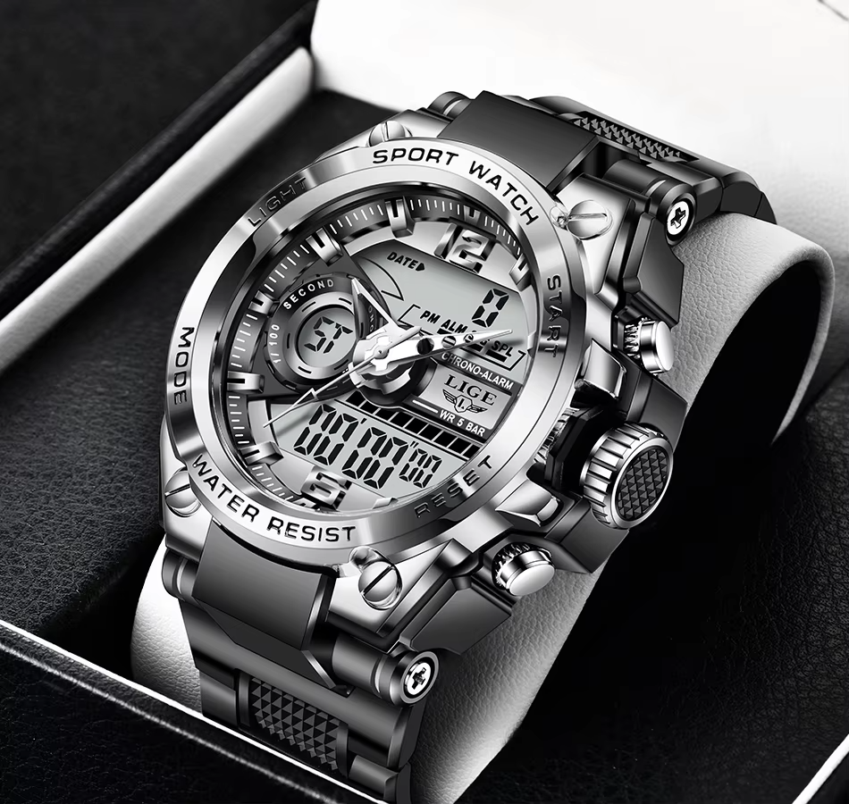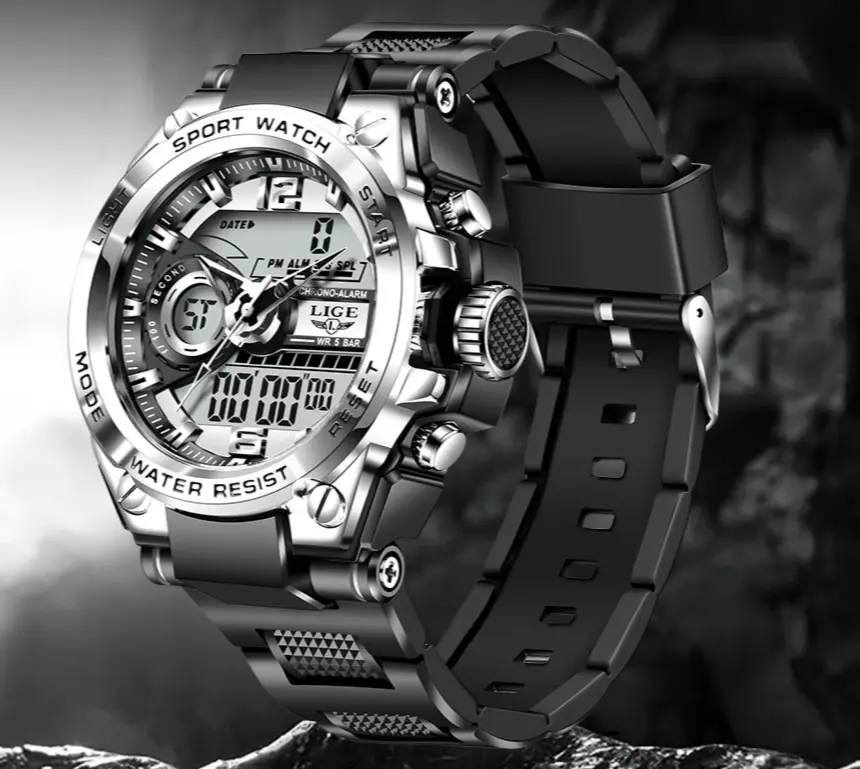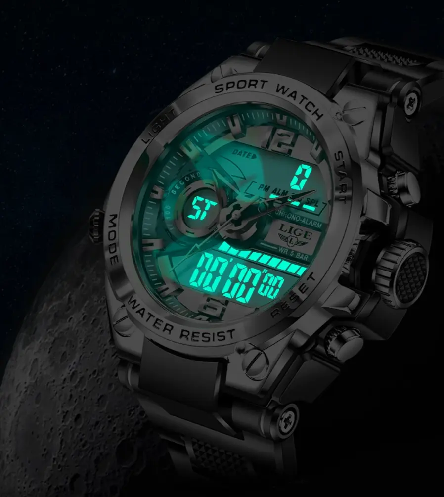Relógio militar com tecnologia LED unido com a elegância dos ponteiros análogos.